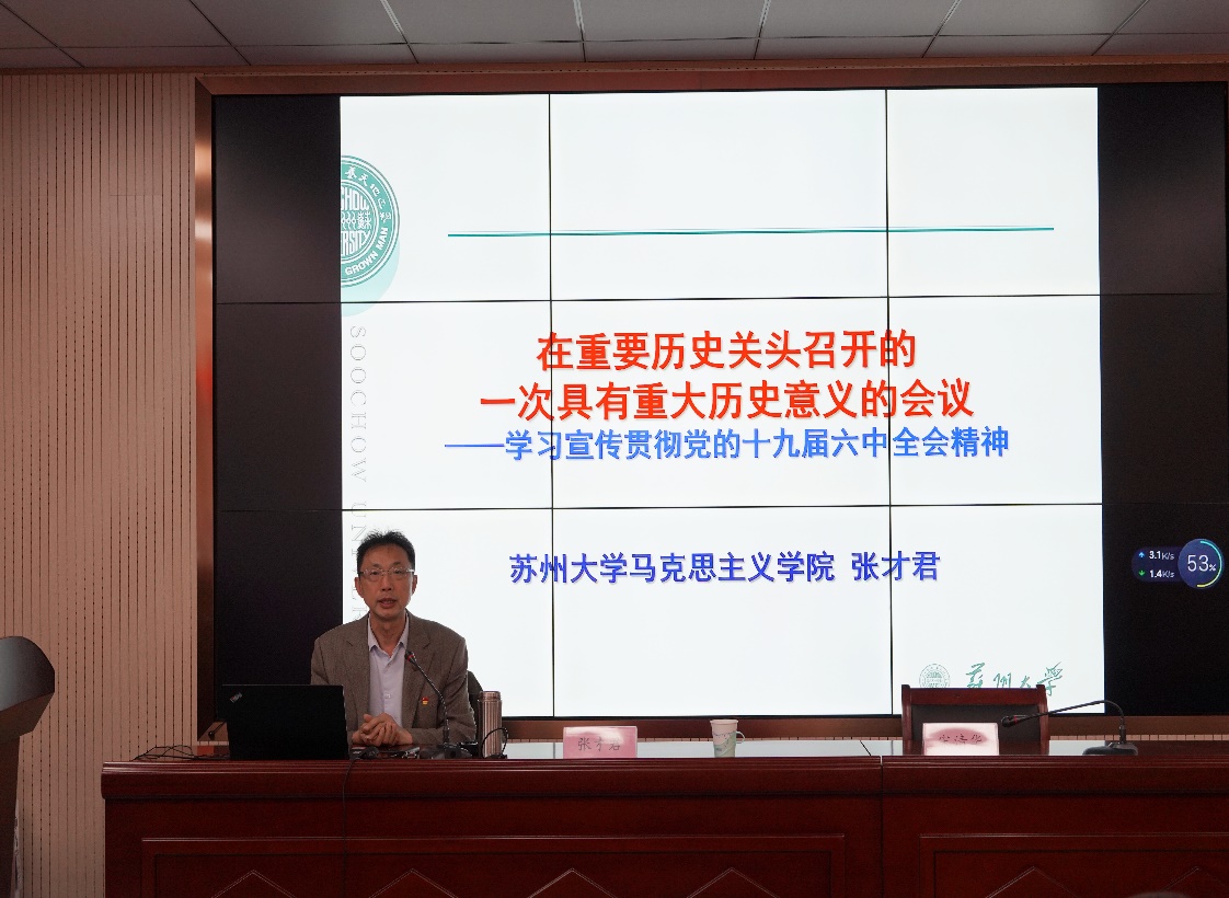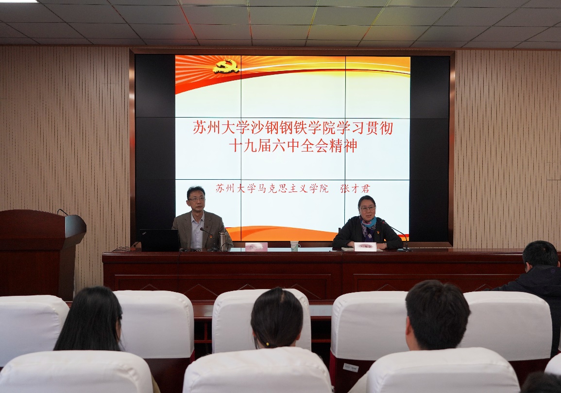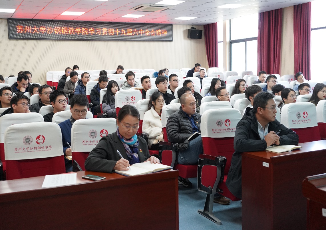 12月23日下午,学习贯彻十九届六中全会精神宣讲团报告会在P站 冶金楼3102举行,宣讲会由校宣讲团成员、马克思主义学院张才君教授主讲,P站 全体教工和学生党员参加了学习,讲座由院党委书记宋清华主持。