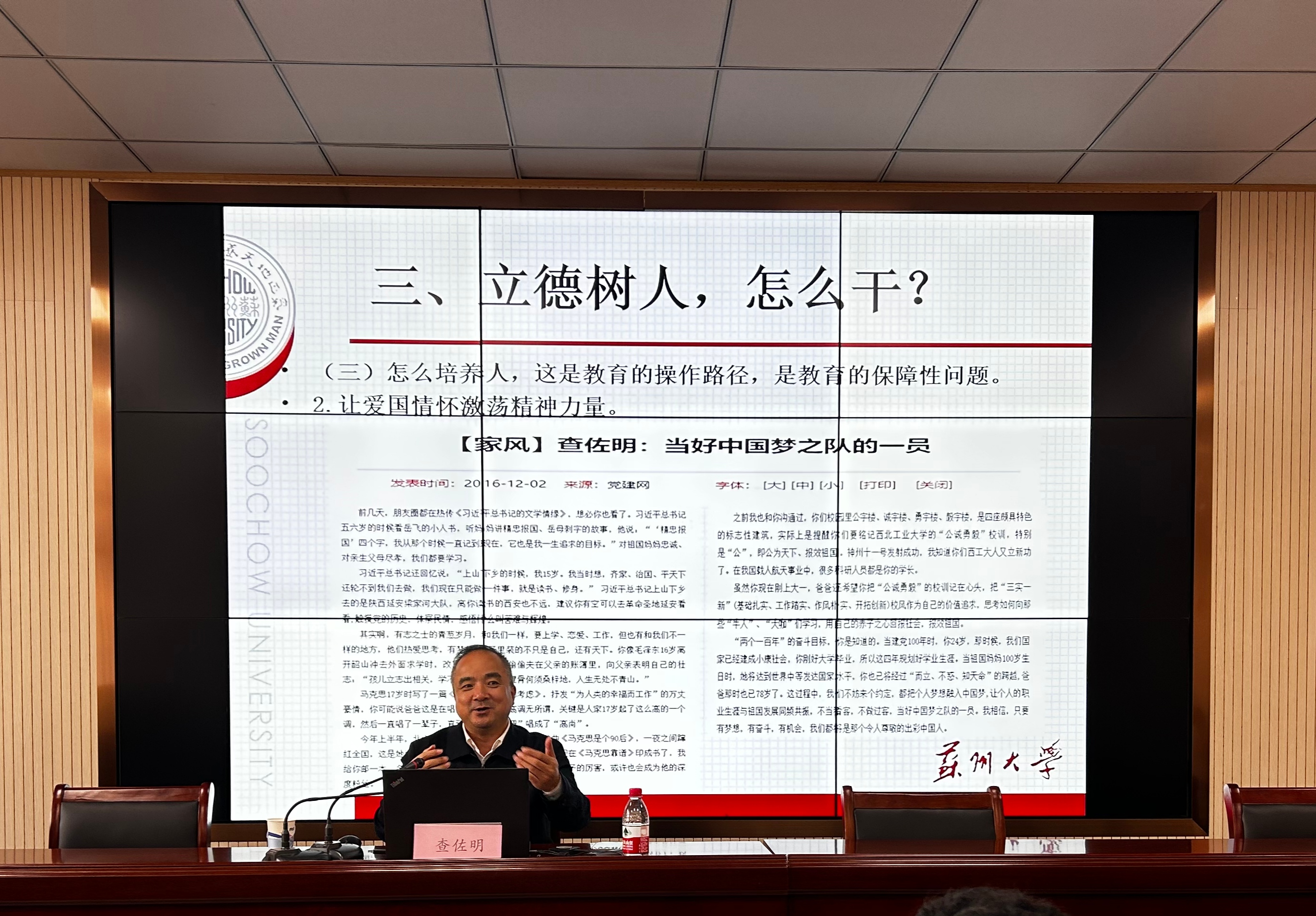 查佐明着重解读了“立德树人,怎么干?”。他通过“为谁培养人、培养什么人、怎样培养人”进行了详细讲述,并强调这个三方面是教育的根本问题,也是建设教育强国的核心课题。同时,查佐明讲述了《当好中国梦之队的一员》家书,和师生们一起观看庆祝中国共产党成立100周年大会上“请党放心,强国有我”的集体献词视频,并向全体同学提出殷切希望:以理想信念塑造挺拔灵魂、让爱国情怀激荡精神力量、以品德修养筑牢价值基石、以知识见识锤炼真正本领、以奋斗精神铸就青春底色、以综合素养书写精彩人生。