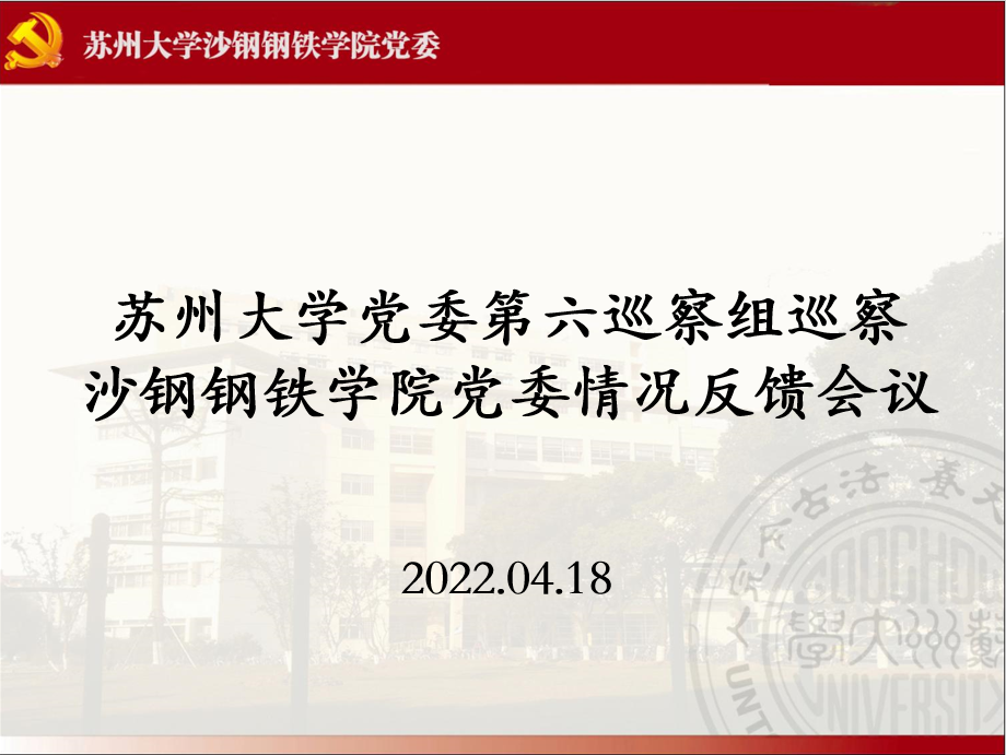 首先,校党委第六巡察组陈卫昌组长向学院反馈此次巡察情况。他指出,2018 年以来,P站 党委能够坚持以习近平新时代中国特色社会主义思想为指导,认真学习贯彻党的十九大及十九二中、三中、四中、五中、六中全会精神,增强“四个意识”、坚定“四个自信”、做到“两个维护”,持续推进“两学一做”学习教育和“不忘初心、牢记使命”主题教育,认真组织开展党史学习教育,融合推进“两在两同”建新功行动和“我为群众办实事”实践活动。认真贯彻落实中央、省委和校党委的重大决策部署,坚持围绕中心、服务大局,强化党建引领,持续推动学院党建工作与中心工作双促双融。学院政治生态良好,党政领导班子能够有效发挥领导核心作用,较好地履行全面从严治党主体责任和监督责任,内部治理体系较完善,管党治党和办学治院工作取得一定成效,学院整体事业发展平稳向上向好,师生认可度较高。但巡察中也发现一些问题、不足以及薄弱环节。针对存在的问题,陈卫昌组长代表巡察组向沙钢学院党委提出整改建议:不断加强理论学习,强化领导班子政治建设,充分发挥党委政治核心作用,持续推进学院治理体系和治理能力现代化;压紧压实“一岗双责”,落实落细监督责任,切实推动全面从严治党向纵深发展;强化党建引领作用,推动党建与业务同频共振、双促双融,持续推进学院内涵式高质量发展;切实履行整改工作主体责任,巩固拓展主题教育成果,推动形成长效机制。