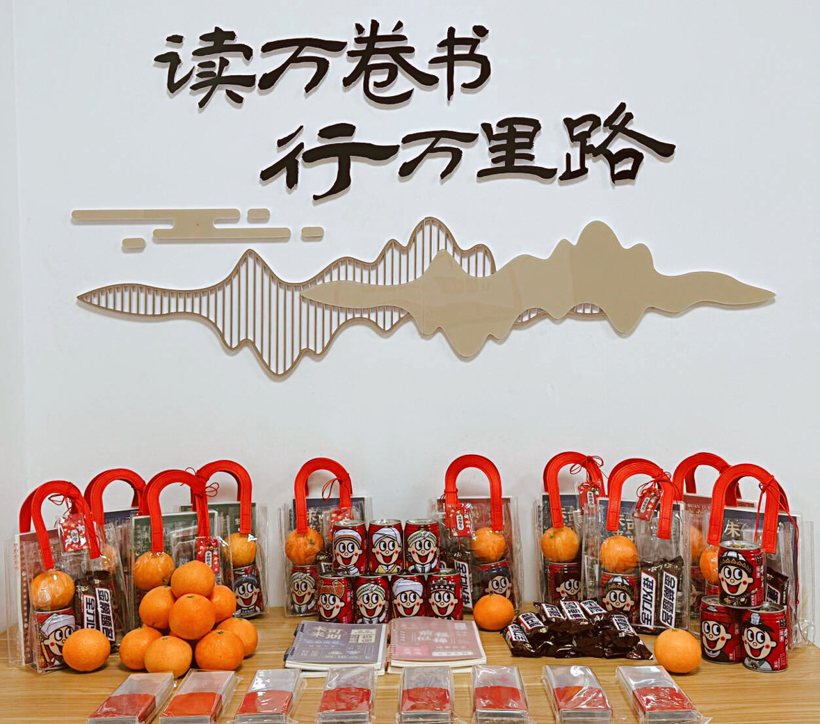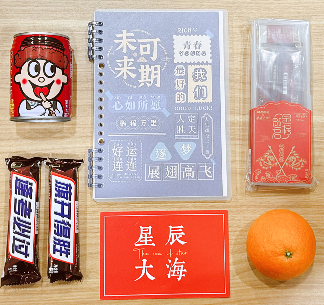 学院为考研的同学准备了带有“金榜题名”的考研加油包,学院领导满载祝福发放给同学们:定制精美文创文具盒、本子、“橙”心如意-橙子、“巧”克难题-巧克力、运气“旺旺”牛奶等。