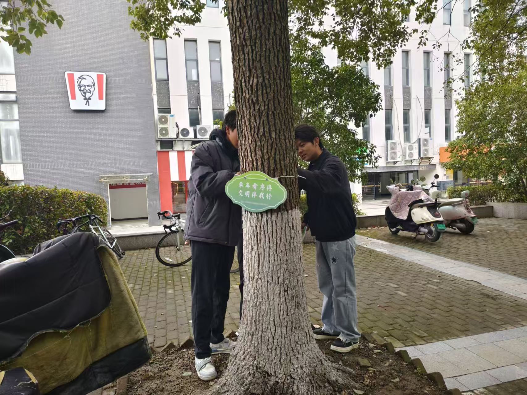 悬挂文明行动提示牌:志愿者们提前准备好文明行为宣传牌,在校园绿化带和共享单车停放区设置“爱护环境”“文明停车”主题提示牌,通过温馨标语提醒师生共同维护校园环境。
