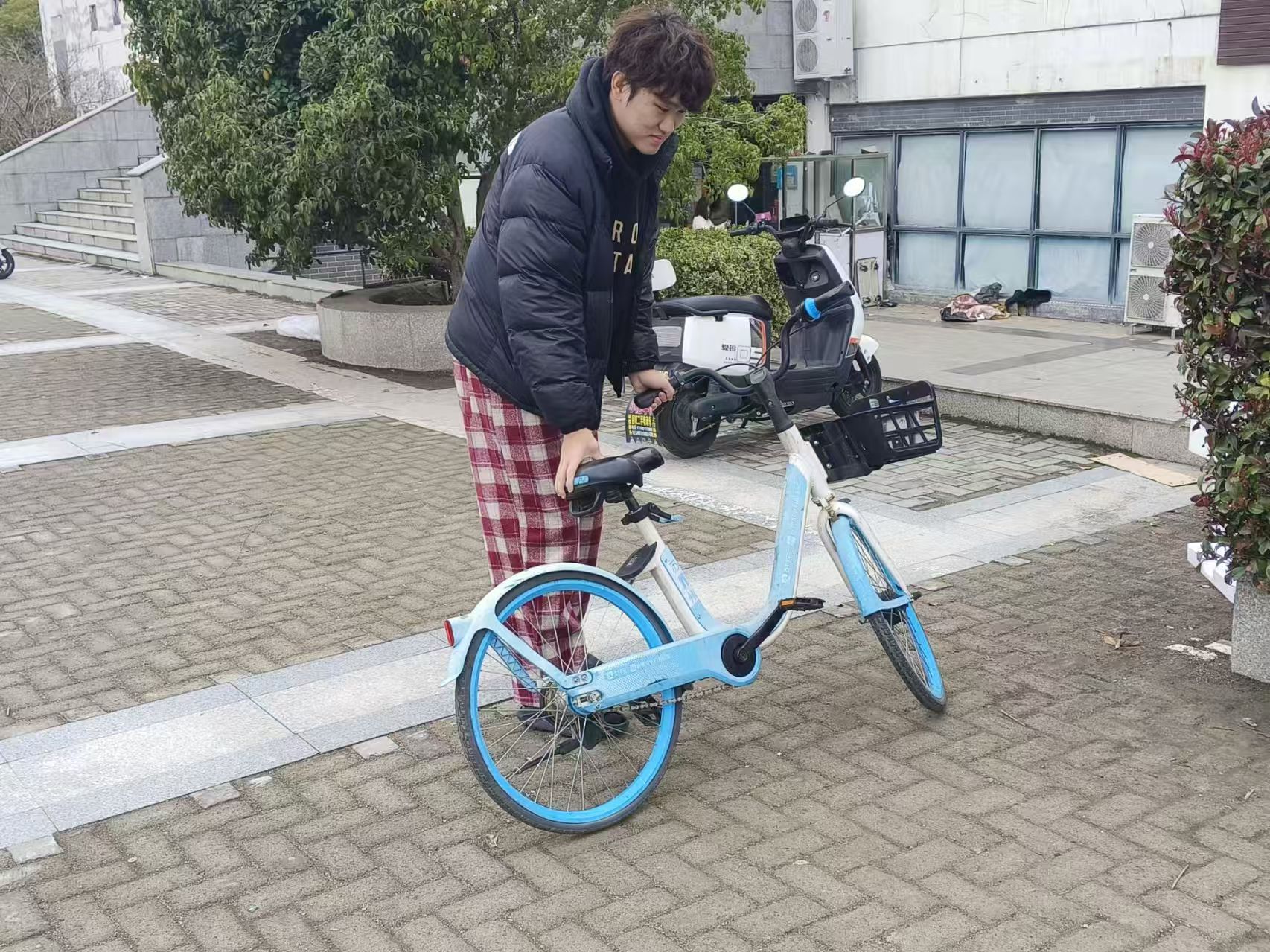 整理有序摆放单车:针对校园内乱停乱放的单车,志愿者们将车辆搬运至指定停放区,摆放整齐,并清理周边杂物,确保道路畅通。同时,志愿者在停放点引导同学规范停车。