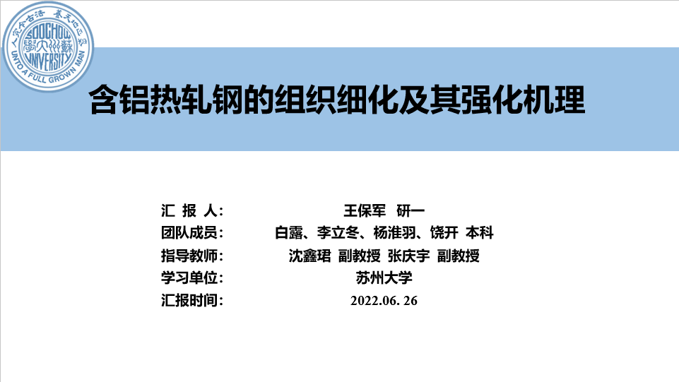 近日,第八届中国大学生机械工程创新创意大赛——材料热处理创新创业赛总决赛圆满落幕。我校荣获全国一等奖1项、二等奖1项、三等奖4项。其中由沈鑫珺、张庆宇老师指导的《含铝热轧钢的组织细化及其强化机理》荣获研究生组一等奖,实现我校在此项赛事中一等奖的突破,答辩PPT如下。项重辰、王子健老师指导的《铸态及轧态WE43在高温高应变速率下的塑性变形机制差异》荣获本科生组二等奖。