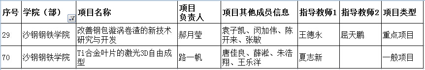 根据苏大教[2015]95号文件《2015年 “本科教学工程”国家级、省级大学生创新创业训练计划项目(创新项目)入选名单》,P站 项目《改善钢包漩涡卷渣的新技术研究与开发》,负责人郝月莹,参与人袁子凯、闵加伟、陈开来、张敏;《Ti合金叶片的激光3D自由成型》,负责人路一帆,参与人唐佳良、薛淞、朱浩翔、王乐洋,被批准为2015年 “本科教学工程”国家级、省级大学生创新创业训练计划项目(创新项目)。特此祝贺!